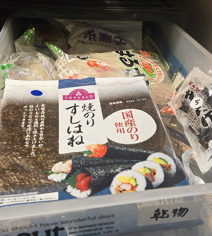 備蓄した商品の中で、ひときわ臭いを出しているのは「乾物」です。鰹節やワカメ、のり、干し椎茸、きくらげなど。