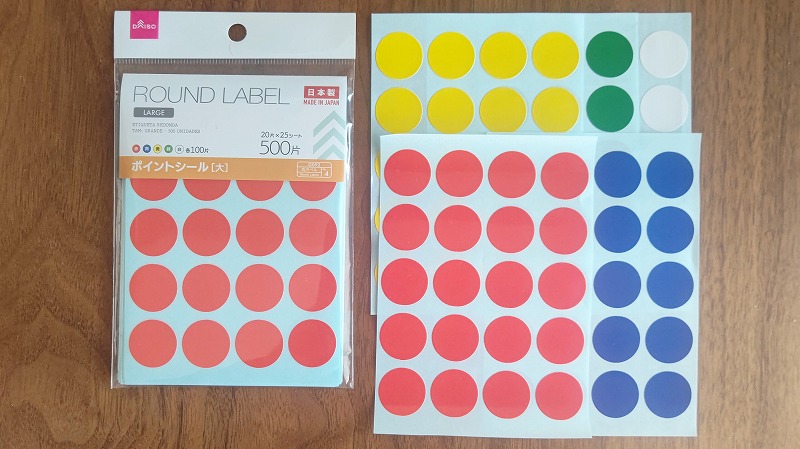 100円ショップ(ダイソー)で購入したROUND LABEL(ポイントシール大)を使い、賞味期限が切れる年ごとに違った色のシールを貼ります。