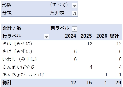 「ピボットテーブルシート」のふりがな(例えば「さば(みそに)」や数字(例えば12)をクリックすれば、該当部分だけの情報を見ることもできます。