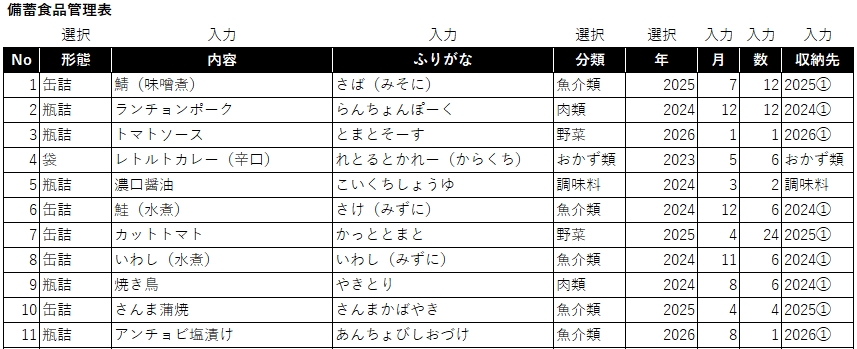 購入した備蓄食品は全てエクセルシートに入力して管理しています。