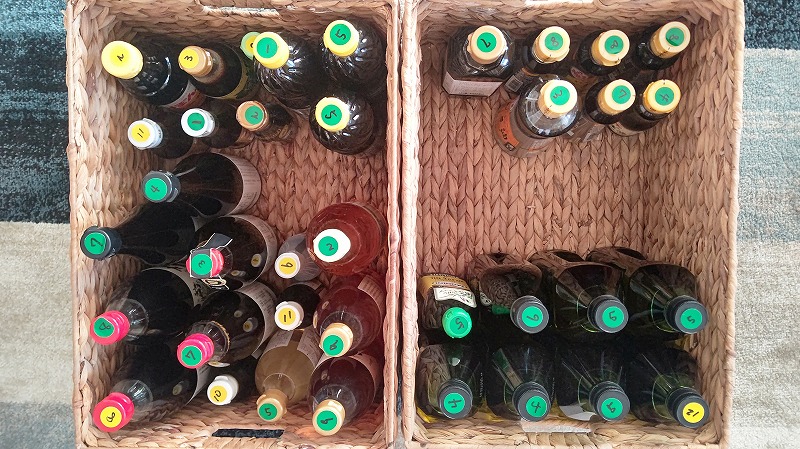箱買いした缶詰/瓶詰は、箱に入れたまま賞味期限が分かるようにカラーシールを貼って管理しています。
