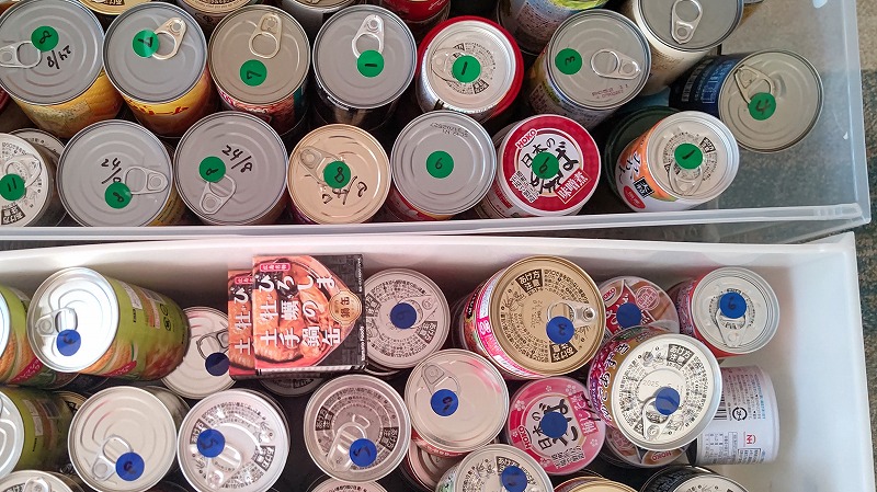 箱買いした缶詰/瓶詰は、箱に入れたまま賞味期限が分かるようにカラーシールを貼って管理しています。