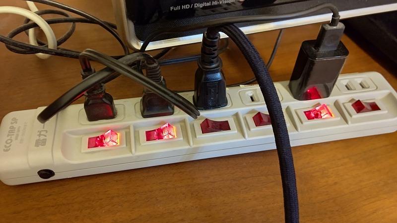 以前の記事で、これまで隠していた「個別スイッチの付いた6個口の電源タップ」をいつでもON/OFFできるように目に見える所に出したことを紹介しました。