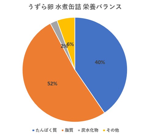 「うずらの卵(水煮缶詰)」の栄養バランスは、タンパク質40%、脂質52%、炭水化物2%で、鶏卵生卵の栄養バランス(タンパク質50%、脂質42%、炭水化物2%)と比べると、脂質が多くタンパク質が少ない結果です。