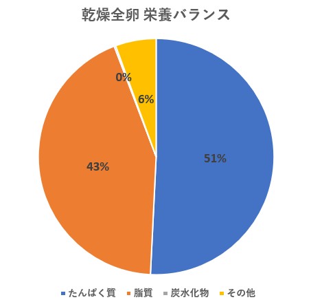 乾燥全卵:タンパク質51%、脂質43%、炭水化物0%、その他6%