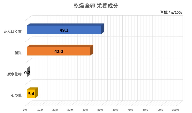 乾燥全卵:タンパク質49.1g、脂質42g、炭水化物0.2g、その他(灰分+食塩相当量)5.4g