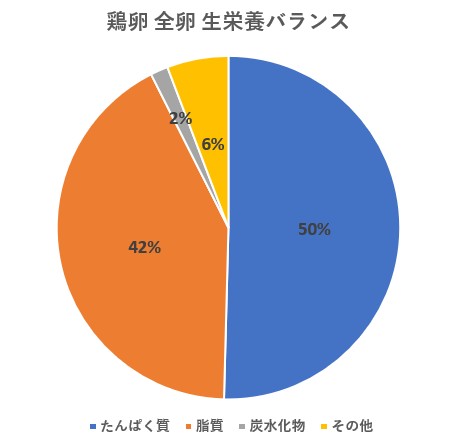生卵:タンパク質50%、脂質42%、炭水化物2%、その他6%