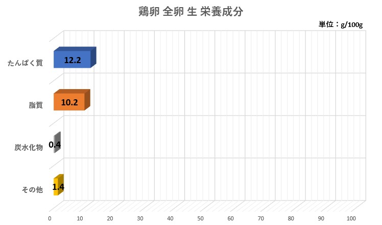 生卵:タンパク質12.2g、脂質10.2g、炭水化物0.4g、その他(灰分+食塩相当量)1.4g