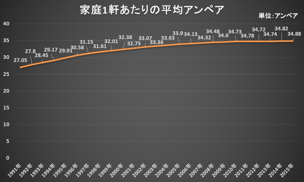 【TEPCO 家庭1軒あたりの使用量と契約電力(当社サービス区域1ヶ月平均)の数字を元にグラフ化】