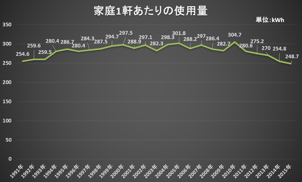 2010年の東日本大震災以降、電気使用量は毎年下がってきたようです。データのない2016~2022年はさほど下がりはないと想像しましたが、今回の電気代値上げの影響で節約する家庭もあると想定し220kWhとしました