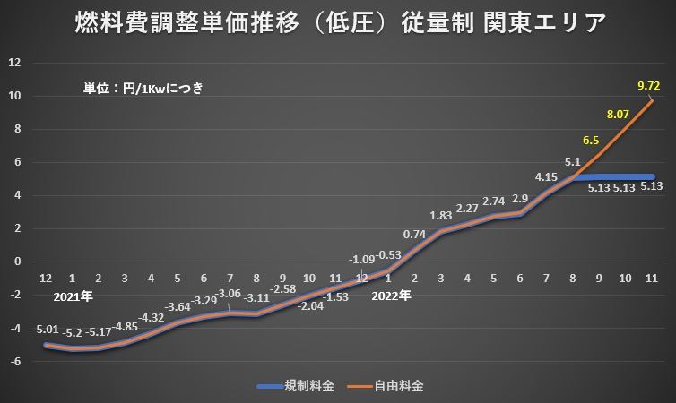 自由料金には上限がないため、燃料費調整額が値上がりした分すべてを利用者の請求額に上乗せされていることを表しています。