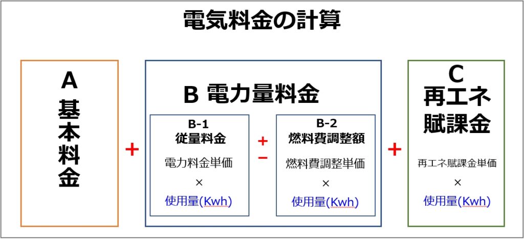 基本的に自由料金も規制料金も同じ計算方法で、電気料金は「A基本料金+B電力量料金+C再エネ賦課金」で計算されます。